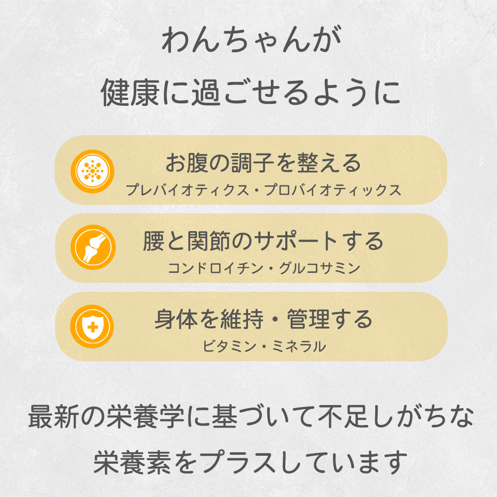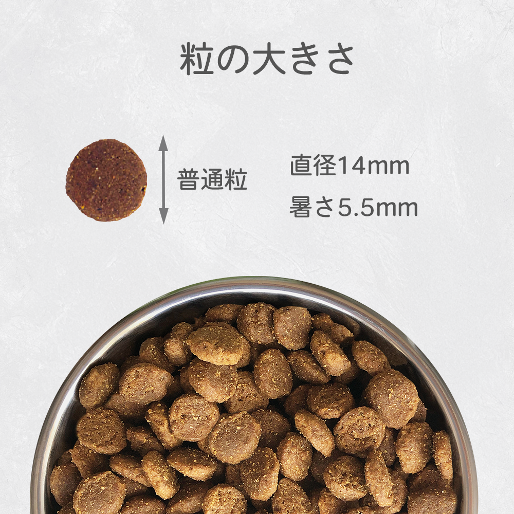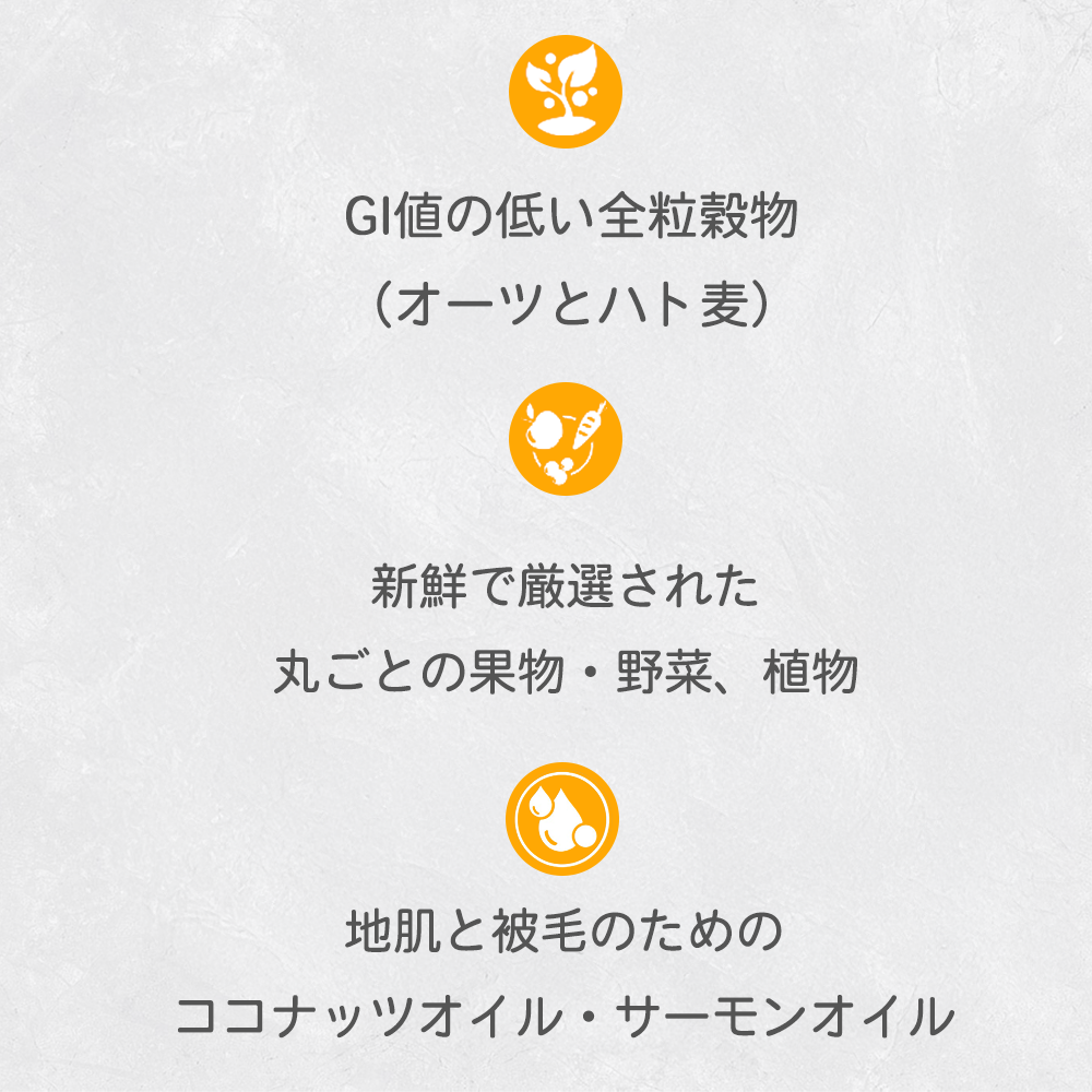 骨抜きチキン、チキンミール、スチールカットオーツ、ハト麦、グリーンピース、赤レンズ豆、チキン脂肪(天然酸化防止剤ミックストコフェロールで保存)、天然チキンフレーバー、天日干しアルファルファ粉、フリーズドライチキンレバー、サーモンオイル、ココナッツオイル、炭酸カルシウム、かぼちゃ、バターナッツスクワッシュ、にんじん、ほうれん草、ブロッコリー、りんご、ブルーベリー、クランベリー、ざくろ、ジュニパベリー抽出物、ジンジャー、フェンネル、カモミール、ペパーミント葉、リコリス根、ターメリック、ビタミン類(E、A、ナイアシン、パントテン酸カルシウム、B2、B6、B1、ビオチン、B12、D3、葉酸)、ミネラル類(硫酸亜鉛、亜鉛たんぱく質化合物、鉄たんぱく質化合物、硫酸鉄、銅たんぱく質化合物、硫酸銅、マンガンたんぱく質化合物、酸化マンガン、ヨウ素酸カルシウム、亜セレン酸ナトリウム)、塩化カリウム、塩、レシチン、塩化コリン、チコリー根抽出物、イースト抽出物、メチオニン、リジン、グルコサミン塩酸塩、コンドロイチン硫酸、ローズマリー抽出物、乾燥L.アシドフィルス菌発酵物、乾燥L.カゼイ菌発酵物、乾燥B.ビフィズス菌発酵物、乾燥E.フェシウム菌発酵物