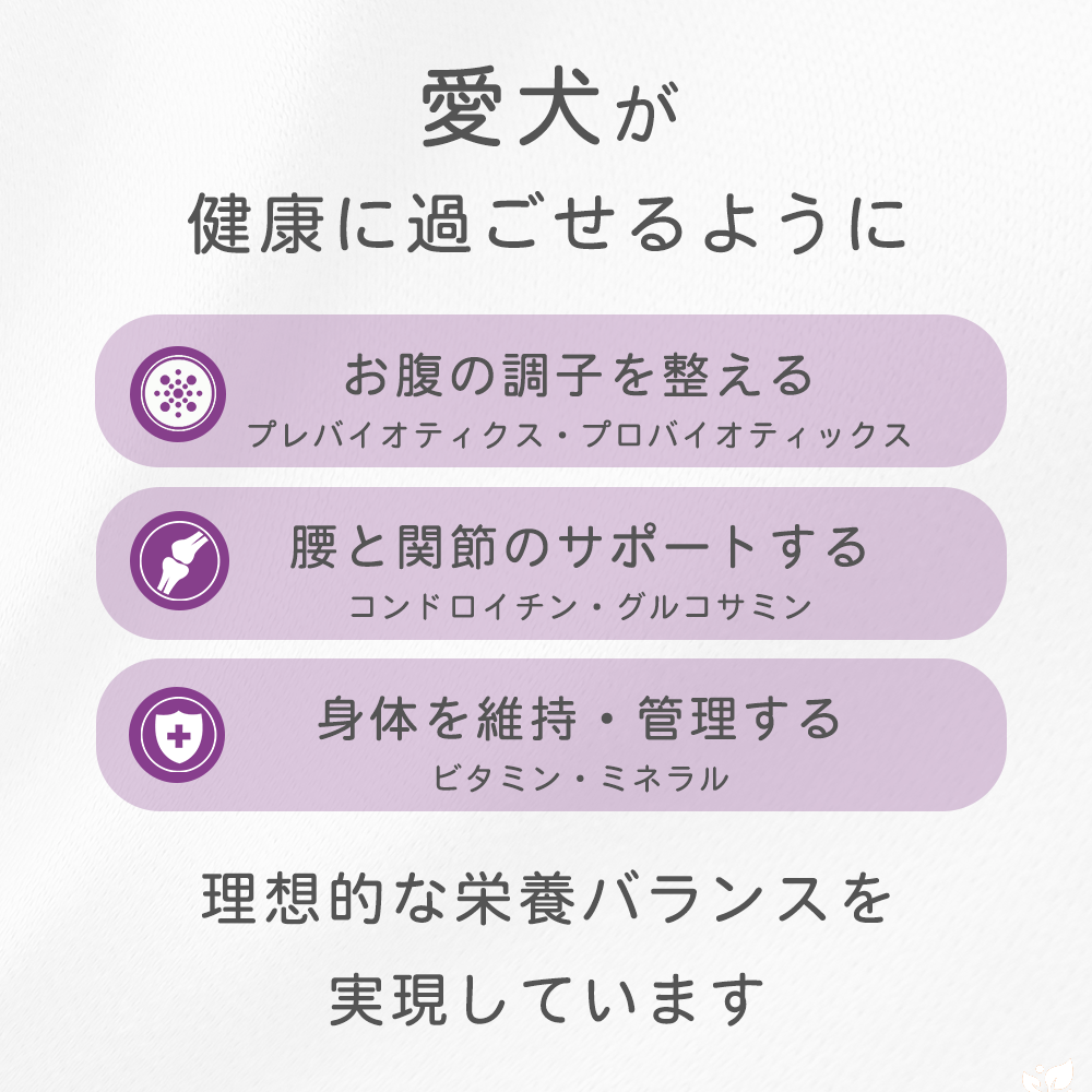 ポーク、ラム、骨抜きダック、ポークミール、グリーンピース、レンズ豆、サツマイモ、ポーク脂肪(ミックストコフェロールで保存)、ラムミール、天然ポークフレーバー、天日干しアルファルファ粉、サーモンオイル、ココナッツオイル、かぼちゃ、バターナッツスクワッシュ、にんじん、ほうれん草、ブロッコリー、りんご、ブルーベリー、クランベリー、ざくろ、ジュニパーベリー抽出物、生姜、フェンネル、カモミール、ペパーミント葉、カンゾウ根、ターメリック、リン酸水素カルシウム、塩化カリウム、塩、レシチン、塩化コリン、ビタミン類(E、A、ナイアシン、パントテン酸カルシウム、B2、B6、B1、ビオチン、B12、D3、葉酸)、ミネラル類(硫酸亜鉛、亜鉛たんぱく質化合物、鉄たんぱく質化合物、硫酸鉄、銅たんぱく質化合物、硫酸銅、マンガンたんぱく質化合物、酸化マンガン、ヨウ素酸カルシウム、亜セレン酸ナトリウム)、メチオニン、イースト抽出物、チコリー根抽出物、乾燥昆布、ユッカ・シジゲラ抽出物、グルコサミン塩酸塩、リジン、タウリン、コンドロイチン硫酸、ローズマリー抽出物、カルニチン、乾燥L.アシドフィルス菌発酵物、乾燥L.カゼイ菌発酵物、乾燥B.ビフィズス菌発酵物、乾燥E.フェシウム菌発酵物