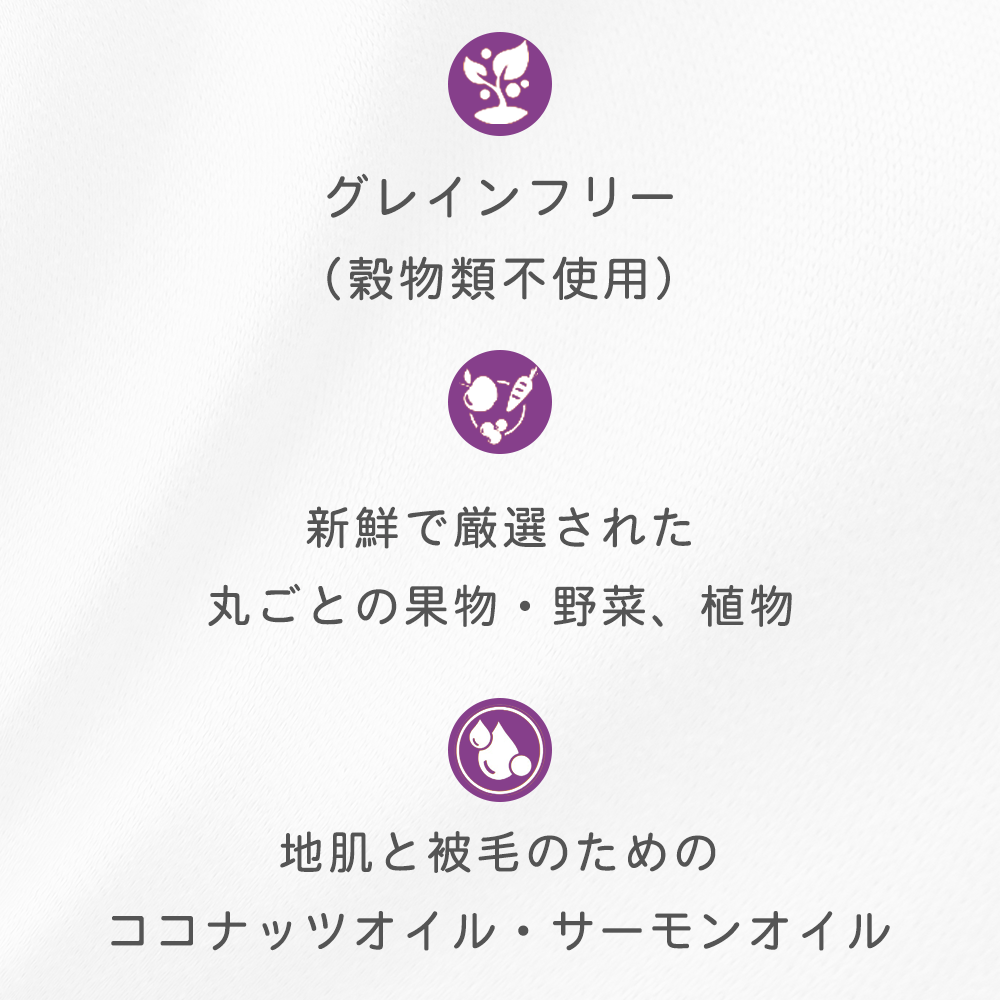 新鮮で冷凍されていない骨抜き豚肉、羊肉、鴨肉、栄養豊富な野菜と果物を使い、衛生管理された工場で作られたドッグフードです。グレインフリー(穀物類不使用)
