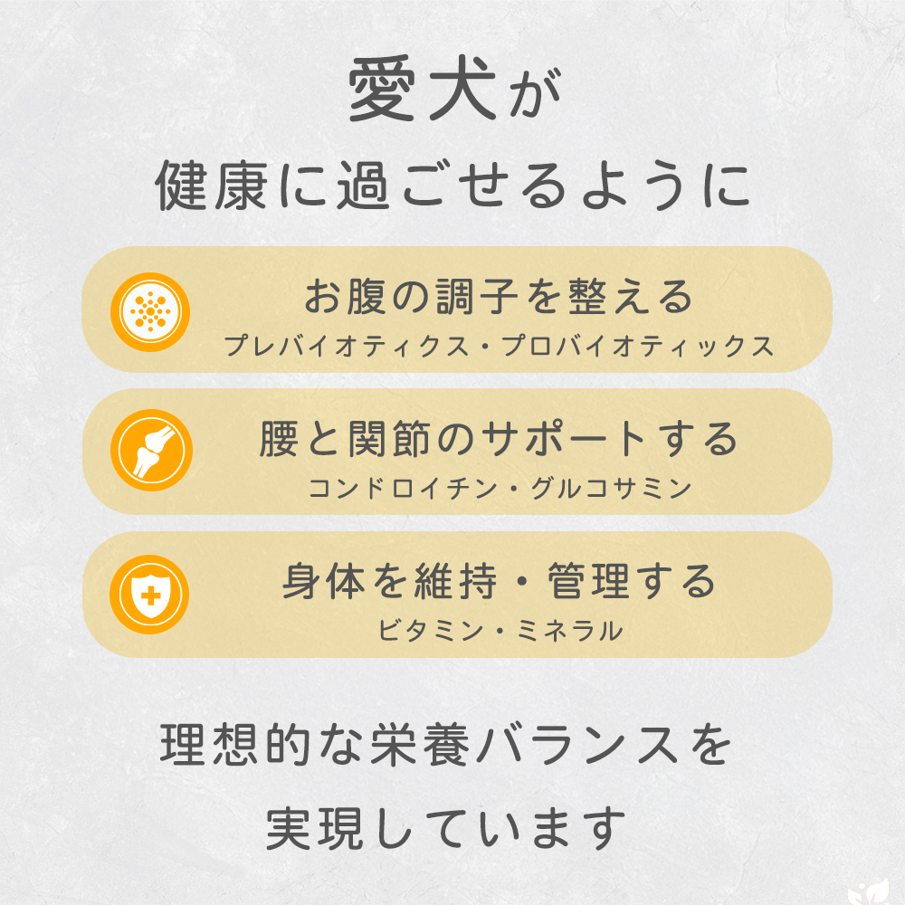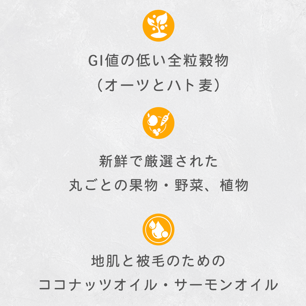 骨抜きチキン、チキンミール、スチールカットオーツ、ハト麦、グリーンピース、赤レンズ豆、チキン脂肪(天然酸化防止剤ミックストコフェロールで保存)、天然チキンフレーバー、天日干しアルファルファ粉、フリーズドライチキンレバー、サーモンオイル、ココナッツオイル、炭酸カルシウム、かぼちゃ、バターナッツスクワッシュ、にんじん、ほうれん草、ブロッコリー、りんご、ブルーベリー、クランベリー、ざくろ、ジュニパベリー抽出物、ジンジャー、フェンネル、カモミール、ペパーミント葉、リコリス根、ターメリック、ビタミン類(E、A、ナイアシン、パントテン酸カルシウム、B2、B6、B1、ビオチン、B12、D3、葉酸)、ミネラル類(硫酸亜鉛、亜鉛たんぱく質化合物、鉄たんぱく質化合物、硫酸鉄、銅たんぱく質化合物、硫酸銅、マンガンたんぱく質化合物、酸化マンガン、ヨウ素酸カルシウム、亜セレン酸ナトリウム)、塩化カリウム、塩、レシチン、塩化コリン、チコリー根抽出物、イースト抽出物、メチオニン、リジン、グルコサミン塩酸塩、コンドロイチン硫酸、ローズマリー抽出物、乾燥L.アシドフィルス菌発酵物、乾燥L.カゼイ菌発酵物、乾燥B.ビフィズス菌発酵物、乾燥E.フェシウム菌発酵物